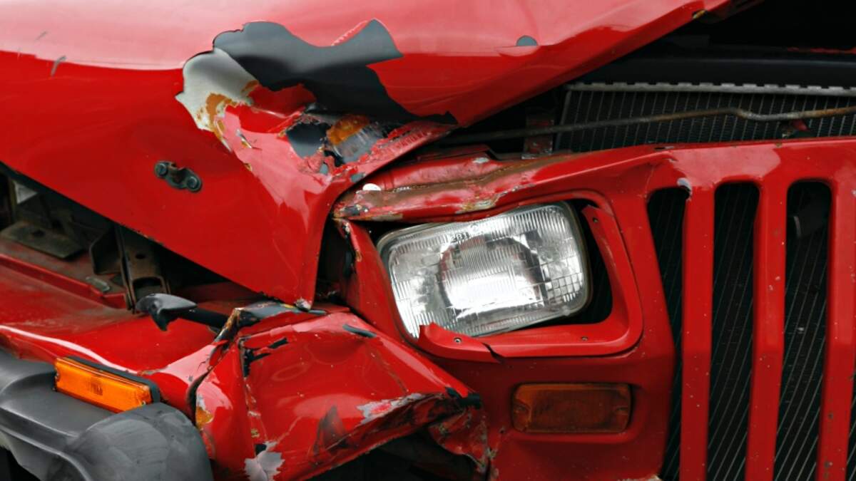 Part of a red truck crushed in an accident